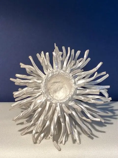 After firing, each piece is hand-polished to bring out the silver’s subtle brilliance. A transparent protective coating is then applied to ensure that the silver remains untarnished over time. This invisible layer protects the artwork from oxidation and environmental damage while preserving the tactile richness of the material.